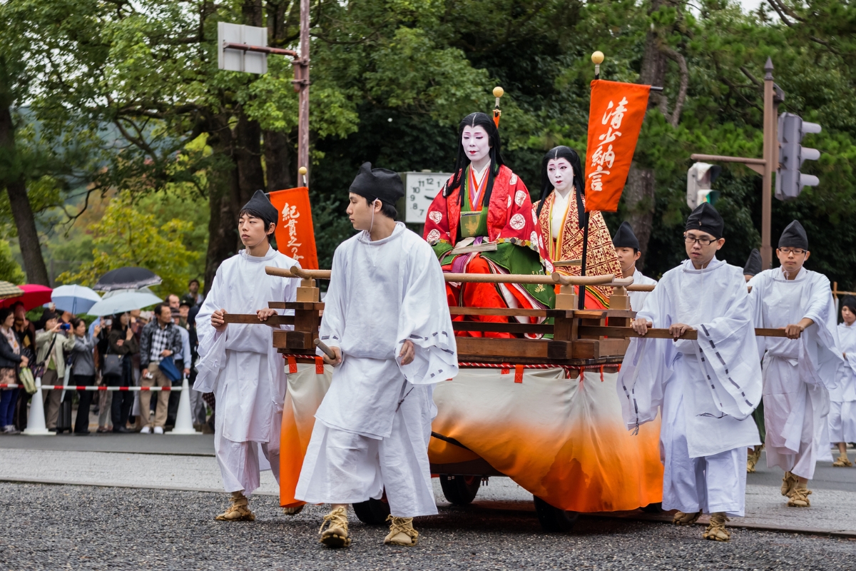 Jidai Matsuri (Lễ hội Thời đại) – Tháng 10: Diễn ra hằng năm vào ngày 22/10, Jidai Matsuri là một trong ba lễ hội lớn nhất của Kyoto, tái hiện hơn 1.000 năm lịch sử qua một cuộc diễu hành quy mô lớn. Hàng nghìn người mặc trang phục truyền thống từ các triều đại khác nhau – trong đó kimono là trang phục chủ đạo, diễu hành từ Cung điện Hoàng gia Kyoto đến đền Heian. Đây là dịp để chiêm ngưỡng sự phát triển của kimono qua từng thời kỳ, từ cung đình Heian, võ sĩ samurai đến các geiko và quý tộc thời Edo.