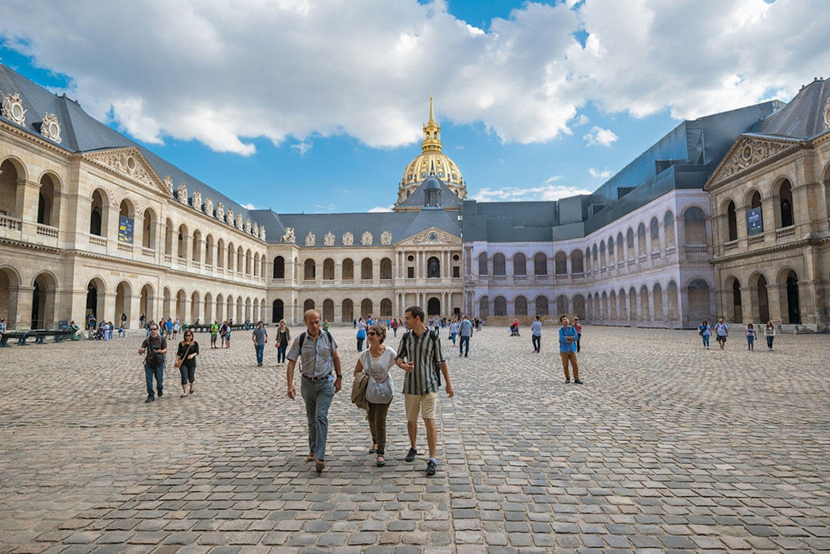 Điện Invalides (Les Invalides) là quần thể kiến trúc lịch sử nổi bật tại Paris, nổi tiếng với mái vòm dát vàng lộng lẫy. Nơi đây từng được xây dựng để chăm sóc cựu binh và hiện là Bảo tàng Quân sự quốc gia Pháp. Đặc biệt, điện còn là nơi an nghỉ của Hoàng đế Napoleon Bonaparte cùng nhiều danh tướng khác. (tham quan bên ngoài)